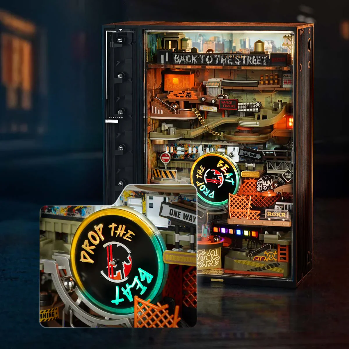- Hip-hop street themed marble run with graffiti-inspired styling and layered urban scene details